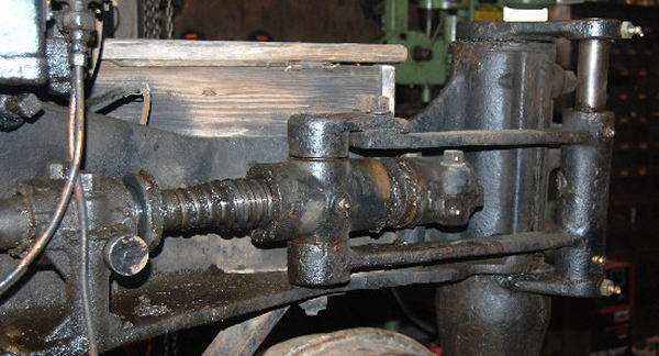 There was an unresolved steering issue which the new owner wanted fixed. It turned out the NOW shiny new shaft at the right is supposed to be stationary with the steering bracket pivoting on IT. The old shaft was severely stuck in that bracket and the whole works was turning in the end bosses. The old shaft was cut out with a torch, the remaining shaft pressed out of the bracket, and a new shaft installed. The other issue was a great deal of play in the horizontal steering shaft (visible to the left of the steering worm) and has been taken up giving about an 85% improvement in the steering wheel free play.